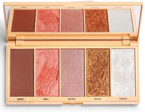 CHOCOLATE FACE PALETTE – PRALINE marki I Heart Revolution. Paleta do makijażu twarzy. W prosty i szybki sposób pomoże w wykonturowaniu twarzy, nadaniu jej przyjemnego rozświetlenia oraz zdrowego i świeżego wyglądu. Składa się z 5 prasowanych produktów o rozkosznie smacznej kolorystyce i nazwach: matowego bronzera, wypiekanego różu, rozświetlacza rozświetlacza, 1 błyszczącego pudru rozświetlającego z drobinkami oraz 1 pudru błyszczącego do podkreślania opalenizny. Całość została umieszczona w bardzo uroczej i kuszącej paletce, stylizowanej na prawdziwą czekoladę. Dodatkowo do zestawu zostało dołączone duże lusterko pod pokrywą zamykającą.Paleta do konturowania.Posiada różne wykończenia.Zawiera róż, bronzer, puder i rozświetlacz.Posiada duże lusterko pod pokrywą zamykającą.POSZCZEGÓLNE ODCIENIE:– TEMPER – chłodny brąz (matowy),– RIPPLE – brzoskwiniowy róż (satynowy),– BON BON – szampański z nutą brązu (perłowy),– PRALINE – złoto-brązowy (perłowy),– FONDANT – perłowy.